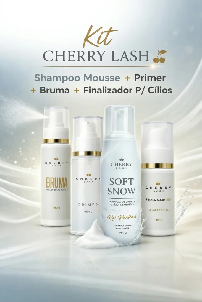 Kit Cherry Lash: Shampoo Mousse 120ml + Primer 90ml + Bruma 90ml + Finalizador Pro 40ml O Shampoo Mousse Soft Snow Cherry Lash proporciona uma limpeza suave e eficaz, mantendo a saúde e a beleza dos seus cílios. Sua fórmula é enriquecida com ingredientes nutritivos, como extratos botânicos e vitaminas, que limpam, fortalecem e condicionam os cílios, promovendo um crescimento saudável. O Primer Cherry Lash proporciona uma aderência perfeita e duradoura para suas extensões de cílios, garantindo um olhar deslumbrante que dura o dia todo. Com apenas algumas borrifadas, o primer possui uma textura líquida que facilita na aplicação. A Bruma Cherry Lash é um produto desenvolvido para aprimorar a retenção das extensões de cílios, proporcionando durabilidade e qualidade incomparáveis durante o procedimento de alongamento. Com uma tecnologia inovadora, esta bruma é a escolha ideal para profissionais que buscam resultados excepcionais. Além de melhorar a retenção da cola, esta bruma também oferece hidratação e refrescância à região dos cílios, proporcionando uma sensação relaxante e confortável. O Finalizador Cherry Lash Profissional oferece cuidados essenciais e prolonga a durabilidade das extensões de cílios. Sua fórmula de alta qualidade proporciona uma camada protetora transparente, garantindo um acabamento impecável e uma aderência duradoura. Contém: - 1 Shampoo Mousse Soft Snow 120ml Cherry Lash - 1 Primer 90ml Cherry Lash - 1 Bruma 90ml Cherry Lash - 1 Finalizador Pro 40ml Cherry Lash