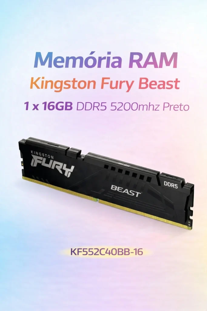 Memória Ram Kingston Fury Beast Gamer DDR5 16GB 5200Mhz CL40 - Preto - A latência CL40 da Kingston Fury Beast é projetada para otimizar a rapidez, tornando cada ação mais fluida e responsiva. Além disso, a memória conta com um dissipador de calor, que assegura que o seu sistema permaneça refrigerado mesmo durante as sessões de uso intenso. Com suporte a AMD EXPO, você pode facilmente ajustar as configurações para um desempenho ainda maior. >> FICHA TÉCNICA: - Marca: Kingston - Modelo: Fury Beast - Compatibilidade: PC - Capacidade: 16GB (1 x 16GB) - Cor: Preto - Modelo Numérico: KF552C40BB-16 - Clock: 40 - 5200MT/s - 1.25v - Padrão DDR5
