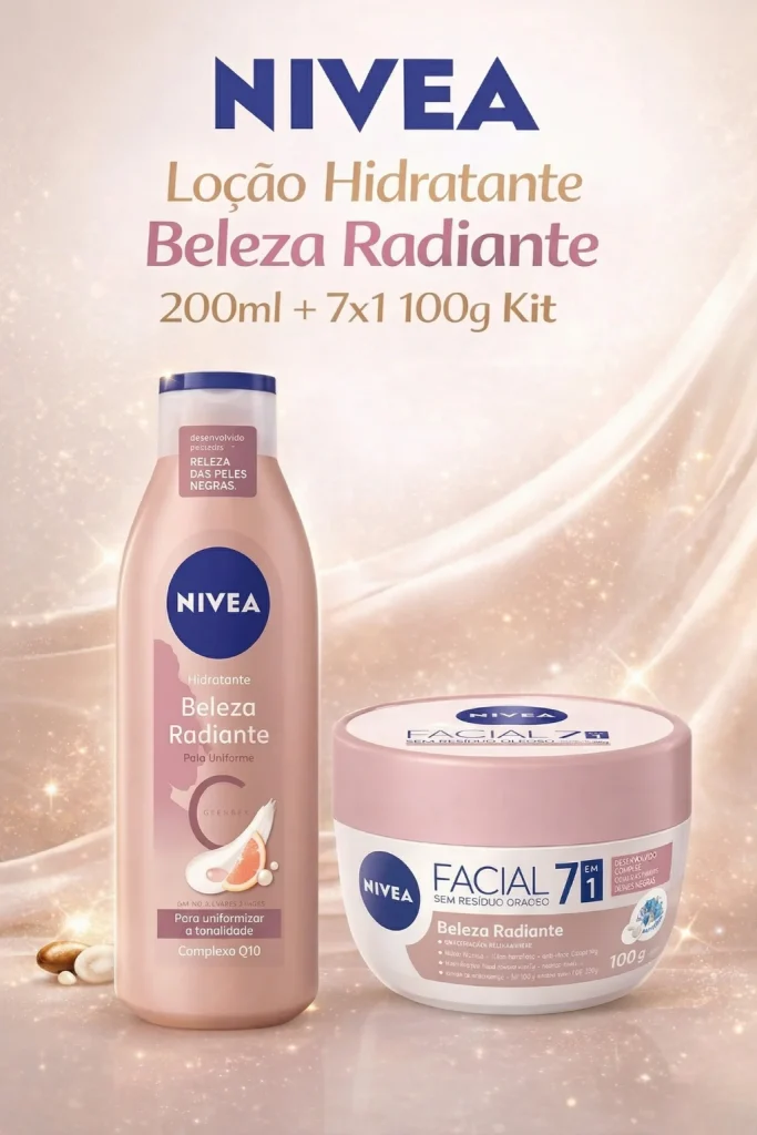 Descrição Kit 1 NIVEA Hidratante Corporal Beleza Radiante Pele Uniforme 200ml + 1 Creme Hidratante Facial 7x1 100gr ESPECIFICAÇÕES: Marca: Nivea Linha: Beleza Radiante Conteúdo: 200 ml BENEFÍCIOS: 48h de hidratação profunda Uniformiza o tom da pele em 2 semanas Auxilia na reparação das áreas ressecadas Fórmula enriquecida com Vitamina C e Extrato de Pérola Teste de percepção. Resultados dependem do uso contínuo do produto MODO DE USO: Aplique o produto no corpo duas vezes ao dia, massageando a pele suavemente. Use o produto diariamente para garantir melhores resultados. ATENÇÃO: *Uso externo. *Não ingerir. *Caso haja contato com os olhos, lave-os abundantemente. *Se houver irritação, suspenda o uso imediatamente e procure orientação médica. *Conservar em local seco e arejado, protegido da luz e da umidade. *Mantenha fora do alcance das crianças. Benefícios do Creme Uniformizador Facial Nivea Beleza Radiante: - Controla a oleosidade e promove efeito matte. - Uniformiza o tom de pele, ilumina e hidrata. - Oferece proteção UVA e UVB. Garantia do vendedor: 7 dias