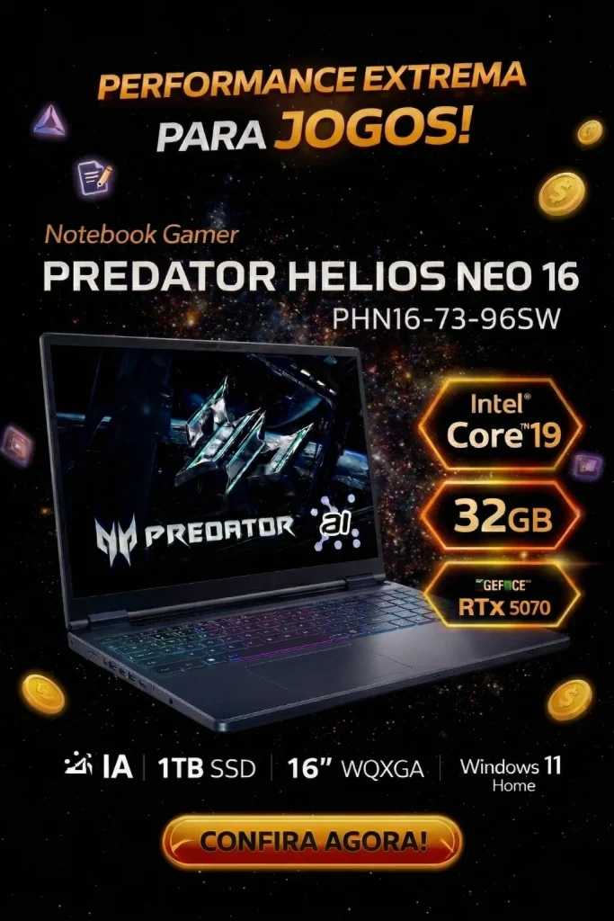 Modelo: PHN16-73-96SW Sistema operacional Windows 11 Home 64 bits Processador Intel Core Ultra 9 275HX Processador com NPU Intel AI Boost integrado, até 13 TOPS 24 núcleos (8 Performance-cores e 16 Efficient-cores) 24 threads Frequência de até 5.4 GHz 40 MB de cache L2 total Memória 32 GB RAM DDR5 de até 6400 MHz 2x módulos SO-DIMM de 16 GB cada ou 1x módulo de 32 GB Para maiores informações, consultar o serviço de atendimento ao cliente Acer: 0800-762-2237 Expansível até 64 GB DDR5 de até 6400 MHz 2 slots SO-DIMM com suporte a módulos de até 32 GB cada